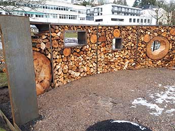 So konnte ich dann auch einen in Kronberg/Mammolshain ansässigen Schreinerbetrieb (Holzdesigner) überzeugen, für uns mit die Tisch- und Bankauflagen zu gestalten. Natürlich hatte dann auch meine begleitende Ingenieurin Sabine Brusius mittlerweile ein Vorentwurf gemacht, so dass wir uns dann im Frühjahr 2017 zu Gesprächen in meinem Büro trafen, um den Gestaltungsplan unseres Schaugartens zu beschließen. Das mit Holzfüllung gestalterische Element (halbes Oval) aus Cortenstahl mit verschiedenen Holzstücken, Durchmessern und vor allem das ausgeschnittene Herz in der Buchenholzscheibe und in der Ecke wieder integriert bzw. verbaut, machte dieses räumliche Element auch zu unserem Kunstwerk bzw. Fotoplatz der ganzen Schau. So ist es vor allem meinem Vorarbeiter zu verdanken, dass diese Holzfällung sich als Kunstwerk entwickelt hat, denn er hat Kreativität mit künstlerischen Elementen verbunden.