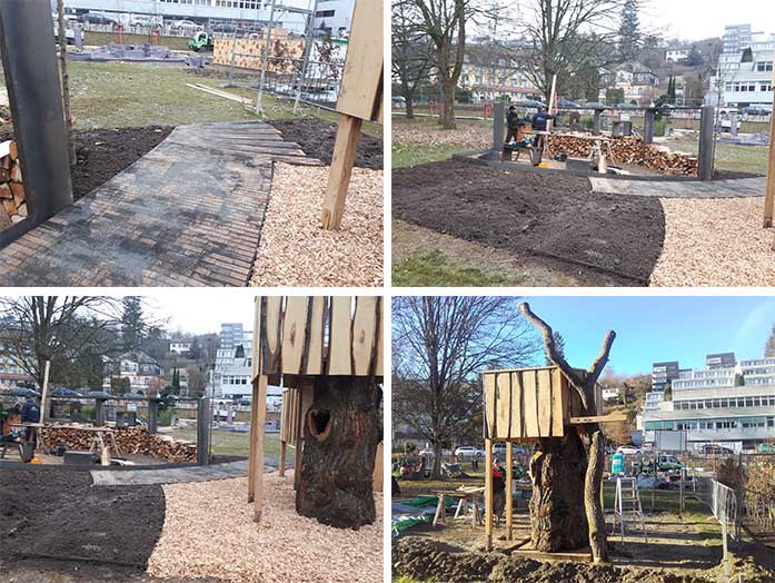 Da die Bepflanzung durch Kräuter und einfache bäuerliche Jahresblüher geprägt waren, bestellten wir rechtzeitig Samen, um diese Qualität dann auch sicher zu stellen. So bereitete ich mit meinen zwei Auszubildenden bereits Anfang Januar 2018 die Aussaatkisten vor, die sich in meinem Wintergarten schnell entwickelten. Diese wurden pikiert und in 6er Töpfe vereinzelt. Ende März 2018, an einem Samstag, platzierten dann der Meister mit seinen Auszubildenden nach Pflanzplan der Planerin die Stauden in dem Schaugarten. Dafür dass der Boden teilweise noch gefroren war, haben die Pflanzen sich gut und schnell sehr kräftig entwickelt. So wurde dann in der Woche der Eröffnung noch das Holzhacksel um den Stamm herum verteilt sowie die 20 m² Rollrasen verlegt.